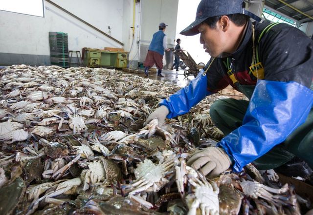 충남 보령시 대천항 신흑동 대천항 내 보령수협 위판장에서 한 직원이 갓 잡아 올린 꽃게를 선별하고 있다. / 뉴스1