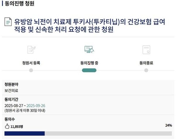 유방암 뇌전이 치료제 '투키사'를 건강보험 급여화 해달라는 국민 청원이 올라온 가운데, 현재 해당 치료제는 제약사가 건보 급여 등재를 신청하지 않은 상태인 것으로 파악됐다.
