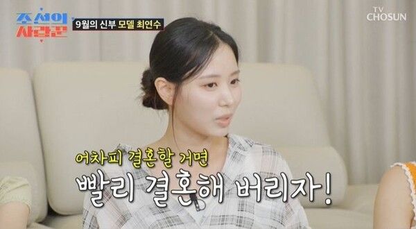 최연수는 "너무 오래 만나기도 했고 어차피 지금 남자친구랑 결혼할 거 같아서 그럴 거면 빨리 해버리자 싶었다. 5년 반 만났다"고 밝혔다.