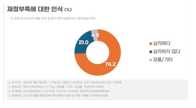 국민 10명 중 7명은 우리나라의 재정 부족 문제가 심각하다고 생각하는 것으로 조사됐다.