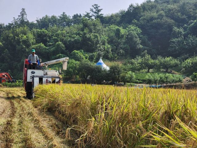 지난 8월 올해 첫 벼베기가 한창인 농가 / 뉴스1