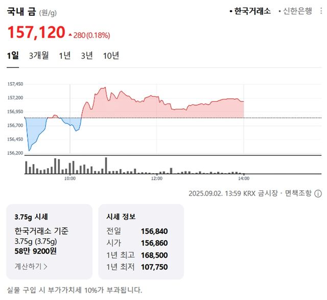 국내 금시세(금값)가 2일(한국 시각) 오후 상승세(전 거래일 대비)를 보이고 있다.