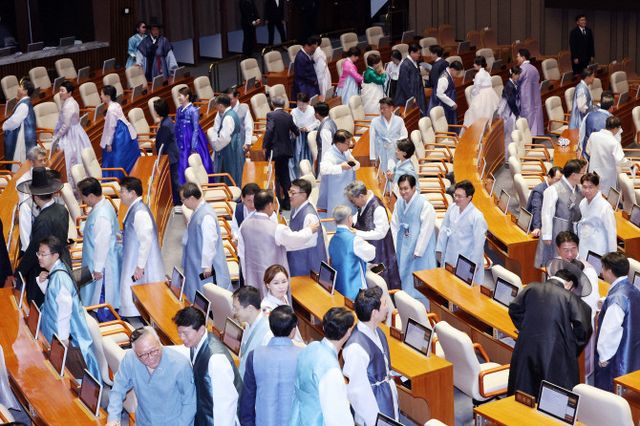 제429회 정기국회 개회식에 한복을 입고 참석한 국회의원들이 지난 1일 서울 여의도 국회 본회의장에서 본회의 산회 후 퇴장하고 있다. ⓒ 연합뉴스