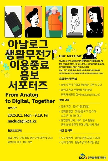 한국방송통신전파진흥원(KCA)은 아날로그 생활무전기 이용 종료 정책의 대국민 홍보와 건전한 전파이용 질서 확립을 위해 국민 참여형 홍보 서포터즈를 모집한다고 2일 밝혔다.