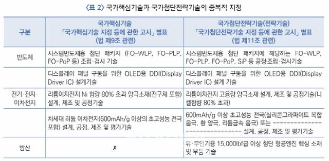 김 위원은 국가핵심기술과 국가첨단전략기술 간 중복 지정 문제도 제기했다. 현재 시스템반도체용 첨단 패키지 기술, OLED용 DDI 설계기술, 리튬이차전지 고용량 양극소재 기술, 초고성능 전극 기술 등 4개 기술이 동시에 양쪽 모두에 지정돼 있다는 것이다.