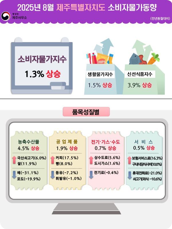 2일 통계청 제주사무소가 발표한 '2025년 8월 제주특별자치도 소비자물가동향'에 따르면, 지난달 제주 소비자물가지수는 115.78(2020=100)로 전월 대비 0.1% 하락했으나 전년 동월 대비 1.3% 상승했다. 전년 동월 대비 상승률은 10개월 연속 1%대 상승 흐름을 유지했는데, 지난해 11월(1.2%) 이후 9개월 만에 최저 수준으로 둔화했다. 이는 휴대전화 요금의 일시적 인하 영향으로, 지난달 휴대전화료는 1년 전보다 21.0% 하락했다.