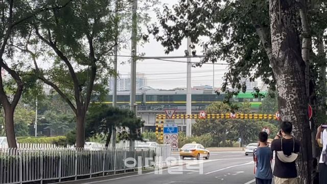 2일 오후 4시(현지시간) 중국 베이징 도심에서는 김 위원장이 탄 것으로 추정되는 열차가 베이징역으로 진입했다. 해당 열차는 녹색 바탕에 가로로 노란 줄이 길게 그어졌다. 열차 앞쪽에는 인공기가 걸려 있어 김 위원장이 탑승한 것으로 추정된다.