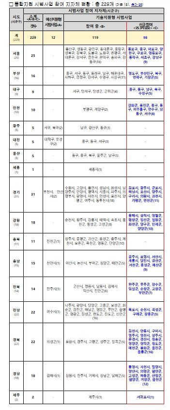 이번 공모에서는 참여 시‧군‧구의 사업추진 의지와 역량, 사업계획의 타당성, 지역특성, 광역-기초 협업방안 등을 종합적으로 평가하여 98개 시‧군‧구를 최종 선정했다.