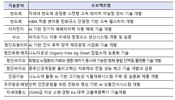 주요 제안 내용은 차세대 반도체 공정용 스캔형 고속 레이저 어닐링 장비 기술 개발, 퇴행성 뇌질환 치료와 염증 제어가 동시에 가능한 항체 융합 단백질 플랫폼 기술 개발, AI 기반 전기차 폐배터리팩 자동 해체 기술 개발 등이다.