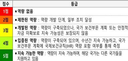 WHO 합동외부평가에서 5점은 ‘지속 가능한 역량’을 의미하는 최고 등급으로, 해당 역량이 지속 가능하며 다른 국가들을 지원할 수 있는 수준임을 인정하는 평가다.
