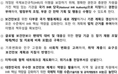 ▲개정된 국제보건규칙 이행을 보장하기 위한 국가 IHR 당국 지정, ▲보건안보를 위한 다부문 국가 행동계획 개발, ▲팬데믹 대비 전담기금 등 장기 재원 조달 체계 구축, ▲기후변화와 인구 고령화 등을 고려한 취약계층 배려, ▲지역사회 협력 네트워크 제도화, 국제적 지원 수준 확대 등이다.