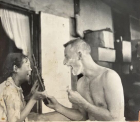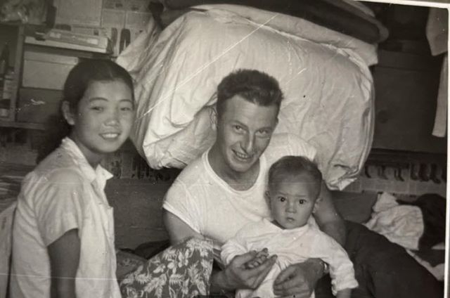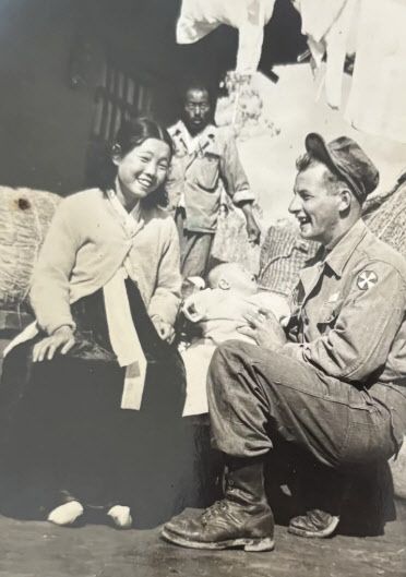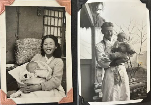 또 다른 사진에선 한국에 주둔하는 미군 육군 제8군 소속임을 나타내는 마크가 새겨진 군복을 입은 남편과 한복 차림의 아내가 아기를 사이에 두고 웃고 있다.