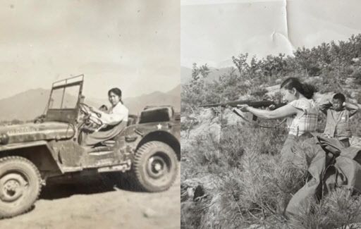 아내가 장총을 들고 사격 자세를 취한 사진이나 군용 트럭 운전대를 잡은 사진은 기존의 고정관념을 깨는 신선함도 느껴진다.