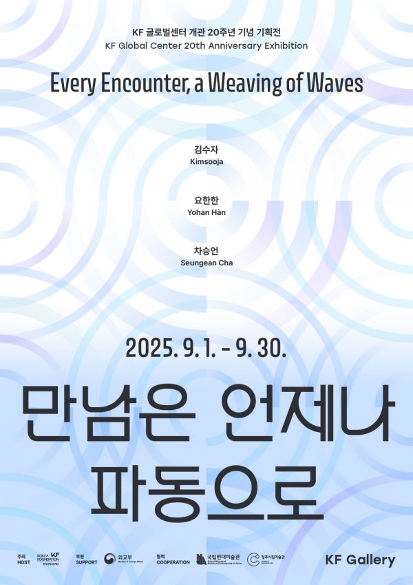 오는 9월 30일까지 KF갤러리에서 열리는 기획전 ‘만남은 언제나 파동으로’는 KF가 지금까지 한국 현대미술을 해외에 알려온 활동을 상징적으로 담은 전시다. 김수자, 요한한, 차승언 작가가 참여해 과거의 흔적, 동시대의 감각, 미래의 교감을 ‘울림’이라는 하나의 구조로 연결하는 작품을 선보인다. 아울러 야외 특별전 ‘서울의 물결, 공명의 밤’도 오는 9월 8일부터 21일까지 청계천 광교갤러리에서 진행된다.