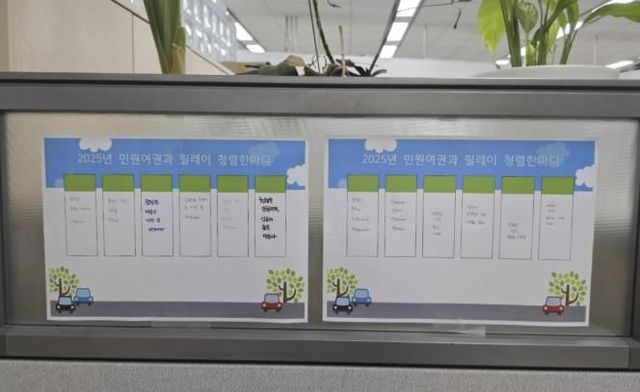 이번 캠페인은 공직자가 스스로 청렴의 가치를 되새기고 일상 속 실천을 다짐하기 위해 마련됐다. 직원들은 각자 청렴을 주제로 직접 문구를 작성하고 이를 부서 내 릴레이 형식으로 이어가며 의미를 더했다.