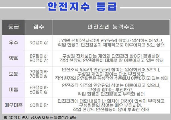 60점 미만은 매우 미흡 등급으로 안전 관리 내용이나 절차에 관한 인식이 부족하고 구성원 참여기 부진하며 작업 현장 안전 활동이 크게 부족한 상태다. 40점 미만인 경우 공사 중지 또는 특별 점검·교육 조치가 내려진다.