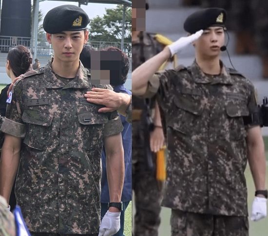 이날 각종 온라인 커뮤니티를 통해 차은우의 수료식 모습이 공유됐다. 군복을 다정히 차려입은 차은우는 늠름한 자태로 이목을 사로잡았다. 군 생활 중에도 변함없는 조각 같은 비주얼이 감탄을 자아내기에 충분했다.