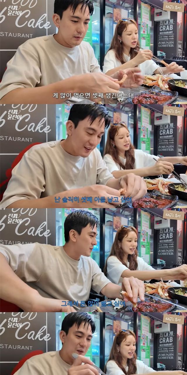 열심히 살을 바르던 윤진이가 "게 많이 먹으면 셋째 생긴다던데"라고 말하자 남편은 "난 솔직히 셋째 아들 낳고 싶어"라며 셋째 욕심을 드러냈다.