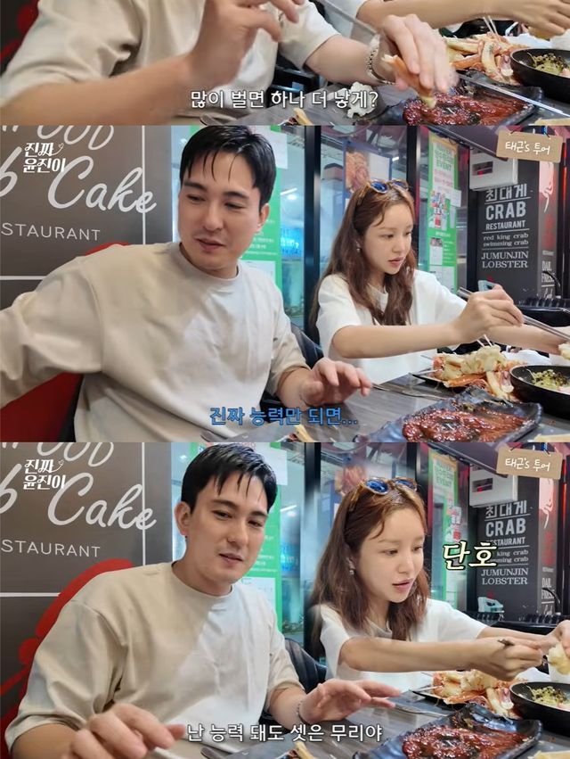 이런 아내의 태도에 남편은 "나 이제 게 먹지 마?"라고 넌지시 물었고, 윤진이는 그저 웃음만 터트릴 뿐이었다.