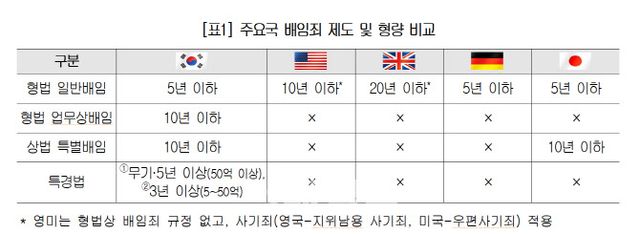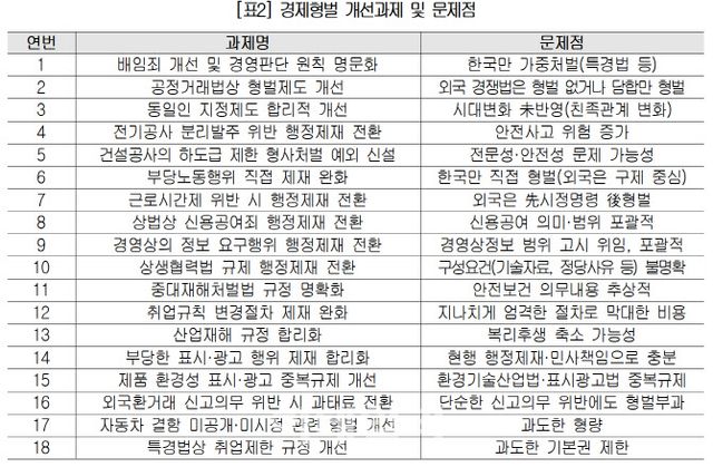 2021년 정부 연구결과에 따르면 우리나라에는 414개 경제 관련 법률에 5886개의 경제형벌 규정이 있다. 이에 지난 8월 정부는 경제형벌 TF를 출범해 과도하고 불합리한 경제형벌로 투자·고용 등 기업 경영활동이 위축되지 않도록 개선해 나가겠다고 했다.