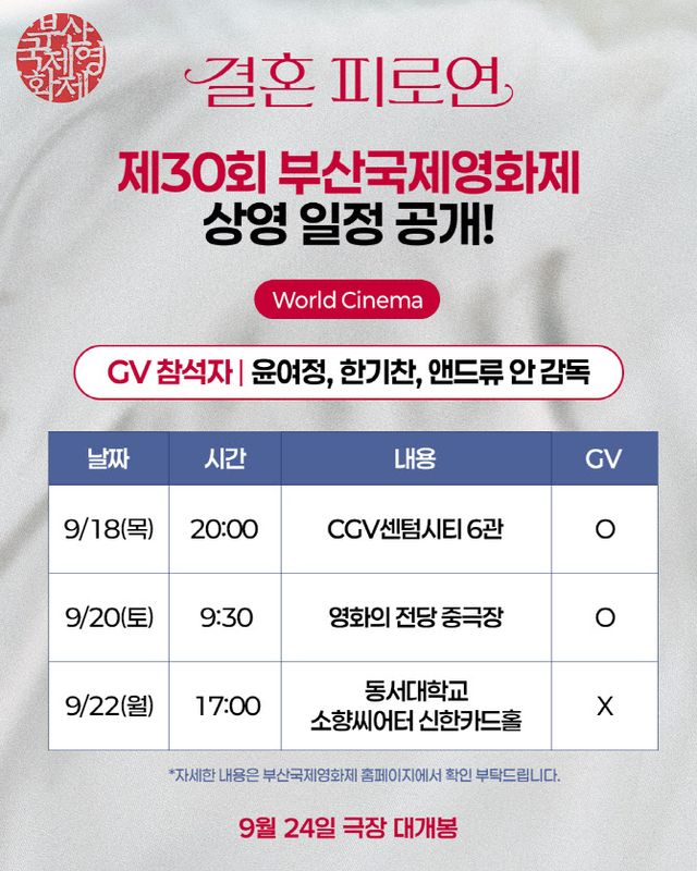 ‘결혼 피로연’은 18일 오후 8시 CGV센텀시티 6관에서 한국 프리미어 상영을 시작으로, 20일 오전 9시 30분 영화의 전당 중극장, 22일 오후 5시 동서대학교 소향씨어터 신한카드홀까지, 총 3차례 상영된다. 18일과 20일 상영 직후에는 배우 윤여정, 한기찬, 앤드류 안 감독이 참석하는 GV가 마련돼 있어, 영화에 얽힌 다양한 이야기를 생생하게 전하며 심도 깊은 대화를 이어갈 예정이다. 이어 19일 오후 4시 영화의 전당 BIFF 야외무대에서 약 20분간 야외무대인사 행사를 진행해 부산을 찾은 관객들과 한층 더 가까이에서 만남을 가질 것이다. 특히 다양한 장르를 넘나드는 섬세한 연출력의 앤드류 안 감독과 깊은 내공으로 압도적인 존재감을 보여주는 윤여정 배우의 만남은 그 자체로 영화제를 빛낼 특별한 순간이 될 것이다. 상영 일정과 GV 라인업까지 공개하며 기대감을 높이는 ‘결혼 피로연’의 부산국제영화제 상영은 9일 오후 2시부터 부산국제영화제 공식 홈페이지에서 예매할 수 있다.