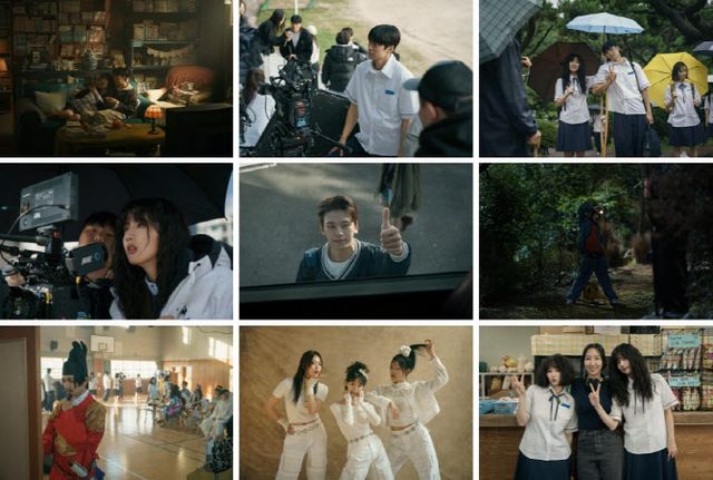 또한 드라마 ‘용의 눈물’ 속 이방원으로 변신한 성래 역의 윤상현, 90년대를 풍미했던 S.E.S.의 스타일을 완벽하게 재현한 ‘솔.방.울’, 마솔지 역의 최규리, 방하영 역의 이소이, 정다울 역의 손희림의 모습은 반가움을 자아낸다. 풍성한 곱슬머리를 자랑하는 신은수와 세리의 라이벌 고인정 역의 강미나, 남궁선 감독의 모습은 ‘고백의 역사’ 만의 사랑스러운 매력을 배가시킨다. 여기에 더해, 교실과 수학여행에서 찍은 단체 사진은 청량하고 싱그러운 에너지를 전하며 화기애애하고 웃음이 가득했던 촬영 현장의 분위기를 짐작하게 한다.