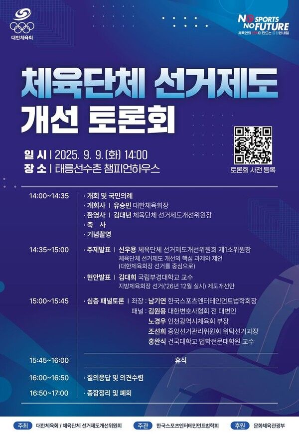 뉴시스 보도에 따르면, 대한체육회 체육단체 선거제도개선위원회가 주최하는 이번 토론회는 대한체육회장·지방체육회장·회원종목단체장 등 각급 체육단체 선거제도의 공정성과 대표성 제고를 위한 개선 방향을 논의하고 현장 의견을 폭넓게 수렴하기 위해 마련됐다.