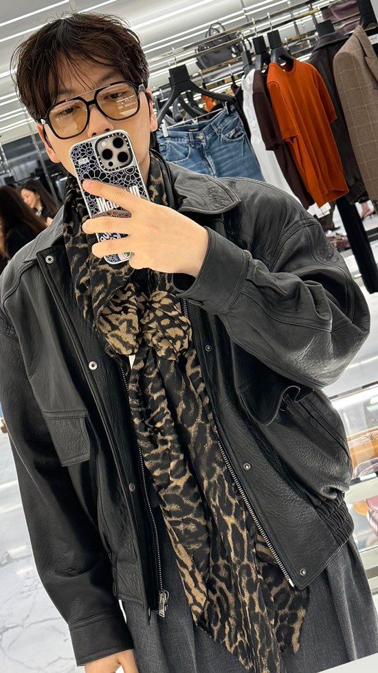 더하여 가죽 자켓과 선글라스, 표범 무늬의 머플러를 더해 입은 룩은 처음 룩과는 같은 검은색 조합에도 불구하고 분위기가 다르게 느껴진다.