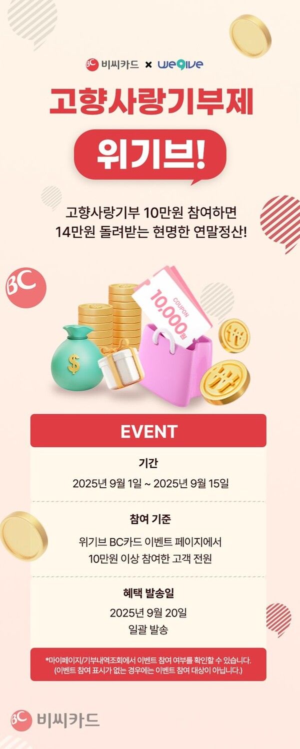 고향사랑기부제 민간 플랫폼 위기브가 BC카드와 협력해 이달 15일까지 페이북 머니 1만원 증정 이벤트를 진행한다고 3일 밝혔다.