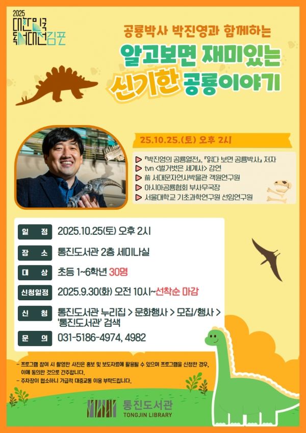 김포시 통진도서관(시장 김병수)은 2025 대한민국 독서대전을 맞아 ‘알고보면 재미있는 신기한 공룡이야기’를 10월 25일 토요일 오후 2시부터 통진도서관 2층 세미나실에서 운영한다.