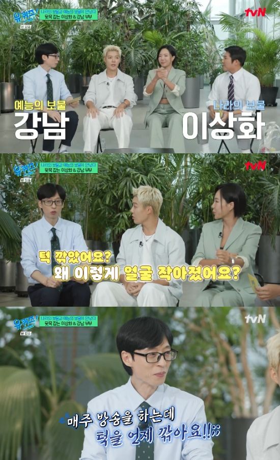 강남은 유재석을 보자마자 "턱 깎았어요? 얼굴이 왜 이렇게 작아졌어요?"라는 돌발 질문을 던졌고, 유재석은 "내가 방송이 계속 있는데, 그럴 시간이 어딨어요"라고 황당해해 했다.