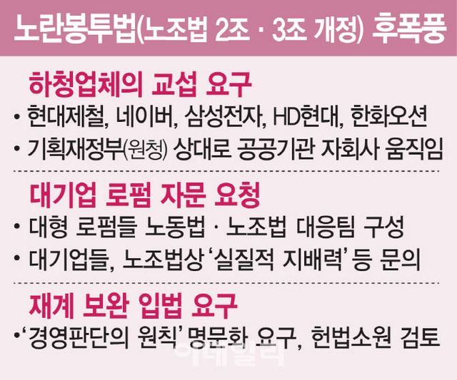 대기업들도 혼란스럽기는 마찬가지다. 한 로펌 고문은 “모 대기업은 사내 협력사를 비롯해 사외 협력사, 부품 납품 회사 등 어디까지 교섭에 응해야 할지 몰라 로펌을 찾고있다”며 “실질적인 지배력이 미치는 범위도 산업안전, 작업통제 외에 임금, 고용까지 넓어지는지 모호하다”고 했다. 김앤장, 광장, 태평양, 세종 등 대형 로펌들은 줄줄이 관련 조직을 만들고 있다. 일부 공공기관 자회사 노조들도 정부를 상대로 직접 교섭을 요구하고자 로펌 측에 문의하는 사례가 잦아졌다고 한다.