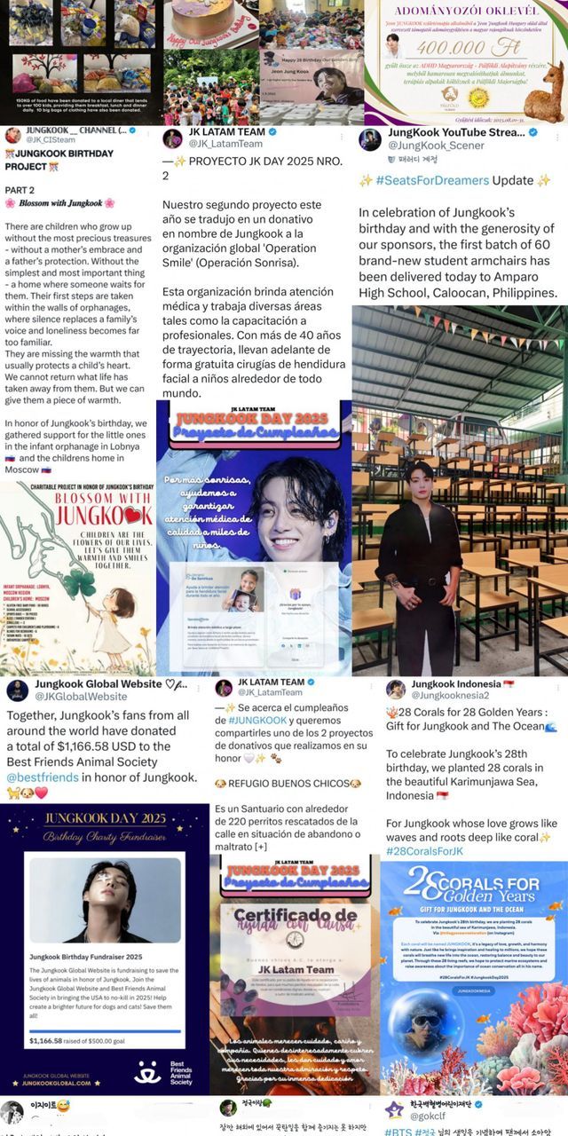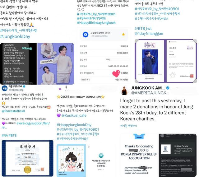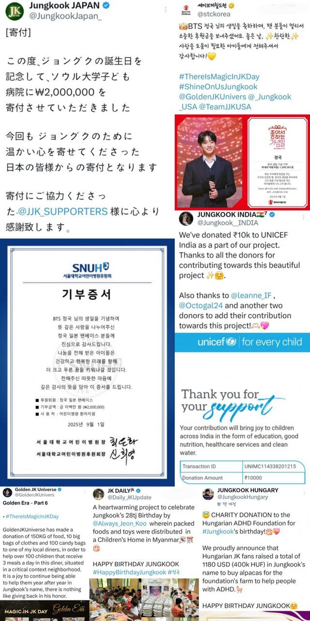 러시아 팬 모임 ‘정국 채널(CIS)’은 모스크바 아동 보호 시설에 이유식과 유모차, 놀이방 매트 등을 전달했고, ‘데일리 JK 업데이트’는 미얀마 아동 보호소에 식품과 장난감을 후원했다. 헝가리 팬들은 ADHD 환자 지원 재단에, ‘JK 라탐 팀’은 구순구개열 아동 수술을 지원하는 국제 단체 ‘오퍼레이션 스마일’에 기부하며 전 세계로 나눔의 울림을 전했다.