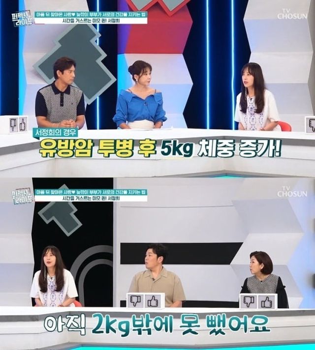 이날 서정희는 과거 유방암으로 투병했던 과거를 언급하며 "아프면 살이 빠진다던데 난 암 걸리고 5kg 쪘다"고 했다. 이에 담당 의사가 체중 조절을 권했다고.