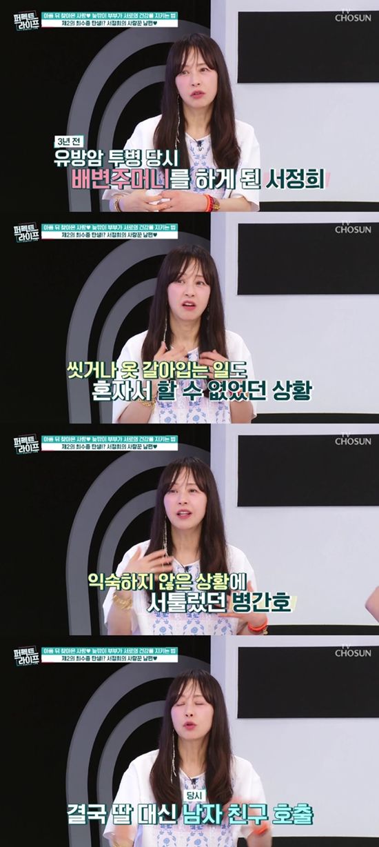 서정희는 "(유방암 투병 당시) 배변 주머니를 차고 있지 않나. 그리고 (씻을 때) 다 벗고 입고해야 하는데 그걸 다 해준 거다"라며 그의 남편이 사소한 것까지 다 챙기게 된 이유에 대해 설명했다.