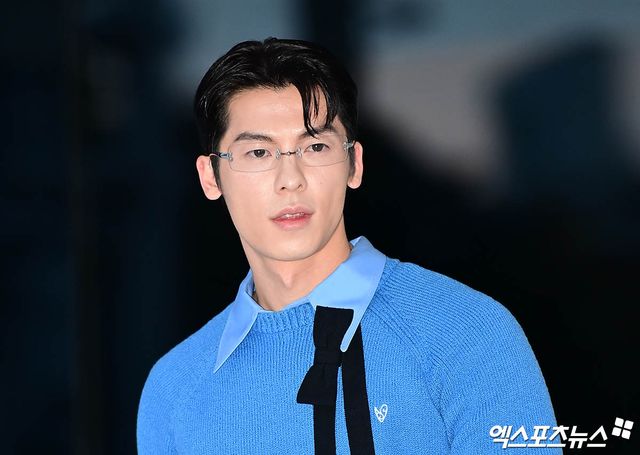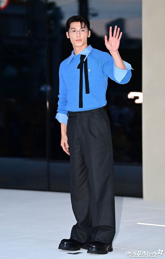 허광한은 블루 컬러 셔츠와 니트에 블랙 와이드 슬랙스를 매치해 세련된 캐주얼 룩을 연출했다. 여기에 무테 안경으로 포인트를 주며 지적인 분위기를 더했다.