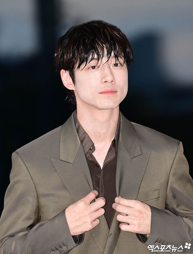 사카구치 켄타로는 짙은 카키색 계열의 더블 브레스트 수트와 톤온톤 셔츠로 특유의 부드러운 매력을 더했다.