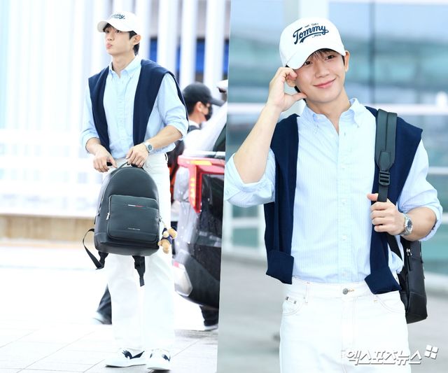 이날 정해인은 산뜻한 프레피룩으로 여행객들의 시선을 사로잡았다. 그는 하늘색 스트라이프 셔츠에 화이트 팬츠를 매치해 깔끔하면서도 청량한 무드를 완성했다. 어깨에는 네이비 니트를 무심하게 걸쳐 포인트를 주었고, 화이트 스니커즈와 볼캡으로 캐주얼한 감각을 더했다. 여기에 백팩과 시계로 실용적인 스타일링을 완성하며 편안하면서도 세련된 공항패션을 선보였다.