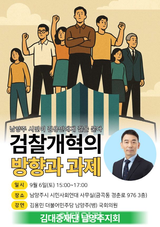 행사는 설문조사를 통해 검찰개혁에 관한 남양주 시민의 의견을 묻고 이를 토대로 국회 법제사법위원회 간사인 김용민 더불어민주당 국회의원의 강연을 들은 다음 참여 시민들과 질의·응답하는 순서로 진행된다.