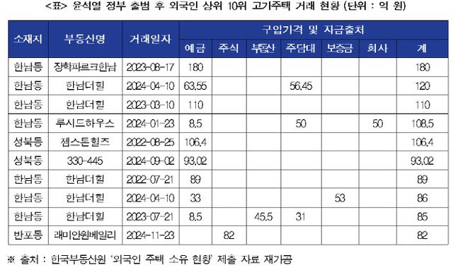 박 의원이 윤 정부가 출범한 이후 외국인 주택 구매자가 제출한 주택자금조달계획서 2899건을 전수조사한 결과 12억 원 이상 고가 주택을 구입한 외국인 거래 건수가 총 546건으로 18.8%를 차지했다. 30억원 이상~50억원 미만 주택 구입 건수는 89건(3.1%), 50억원~100억원 미만 주택 구입 건수는 22건(0.8%), 100억원 이상 주택 구입 건수도 5건(0.2%)에 달했다.
