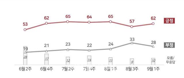 4일 해당 조사에 따르면 이 대통령의 국정 운영을 ‘잘하고 있다’(매우 잘함+잘함)고 응답한 비율은 62%로, 2주 전(8월 3주차)보다 5%포인트 상승했다. 반면 부정 평가는 28%로, 같은 기간보다 5%포인트 감소했다.