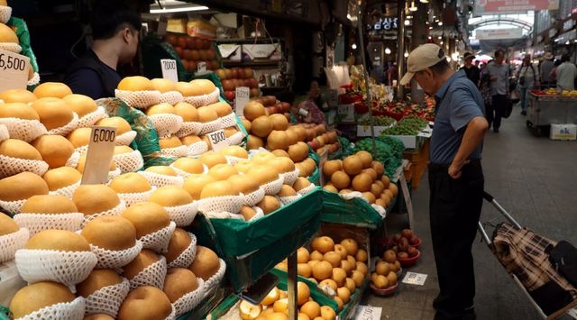 시장에서 매대에 진열된 배를 살펴보는 시민 / 뉴스1