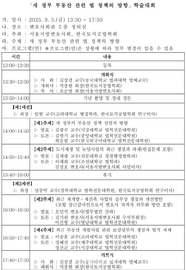 이번 학술대회는 새 정부 출범 이후 변화가 예상되는 부동산 정책 기조를 점검하고, 재개발·재건축, 도시재생, 농어촌 빈집 문제, 개발이익 환수와 보상 등 국민 생활과 직결된 현안을 중심으로 바람직한 대안을 모색하기 위해 마련됐다.
