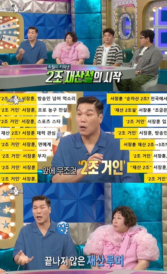 이날 서장훈은 '2조 재산설'에 대해 말했다. 슈퍼주니의 김희철의 입을 통해 이 소문이 퍼졌다는 서장훈은 "처음에는 2조가 아니라 몇 천 억이었다. '이 형 2천억 있다' 하더니 2조까지 갔다"고 말문을 열었다.
