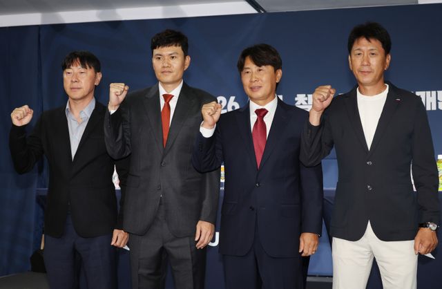포즈 취하는 감독들 (서울=연합뉴스) 신준희 기자 = 4일 종로구 축구회관에서 열린 2025-26 ACL 참가 K리그 4개팀 미디어데이에서 각팀 감독들이 포즈를 취하고 있다. 왼쪽부터 울산HD 신태용 감독, 강원FC 정경호 감독, FC서울 김기동 감독, 포항 스틸러스 박태하 감독. 2025.9.4 hama@yna.co.kr/2025-09-04 10:12:49/ <저작권자 ⓒ 1980-2025 ㈜연합뉴스. 무단 전재 재배포 금지, ai 학습 및 활용 금지>