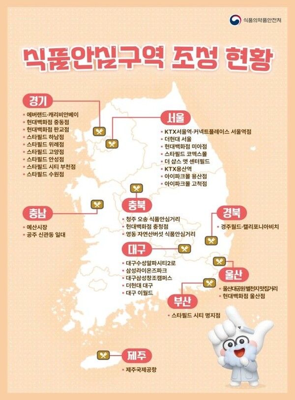 앞서 지난 5월 현대백화점 7개 지점(더현대 서울, 더현대 대구, 미아점, 중동점, 울산점, 충청점, 판교점), 스타필드 9개 지점(하남, 고양, 코엑스몰, 안성, 수원, 위례, 부천, 명지, 더 샵 앳 센터필드)이 식품안심구역으로 지정됐다.