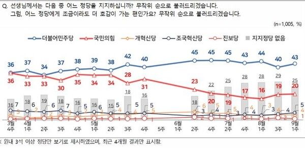 직전 조사(8월3주차) 대비 민주당 지지도는 3%포인트 올랐고 국민의힘 지지도는 1%포인트 올랐다.
