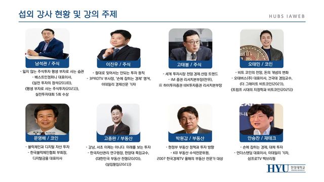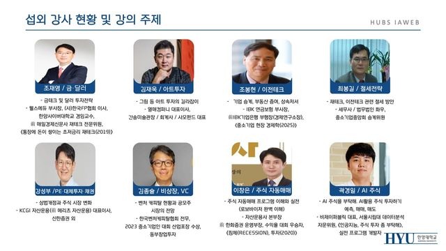 이번 과정은 한양대 공과대학의 기술력과 경영전문대학원의 실전 교육 노하우를 결합, 기존 최고위 과정과의 차별성을 강조했다. 주식, 부동산, 가상자산 등 전통 투자 외에도 AI 자동매매, 블록체인, 아트 투자 등 미래형 대체 투자 전략을 포괄적으로 다룬다.
