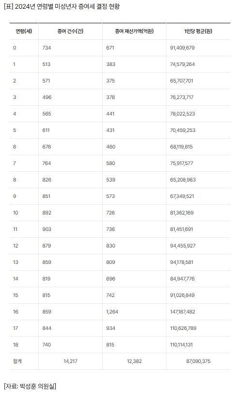 지난해 미성년자(0∼18세) 전체 증여는 1만4천217건, 1조2천382억원으로 집계됐다. 1인당 평균 8천709만원이다.