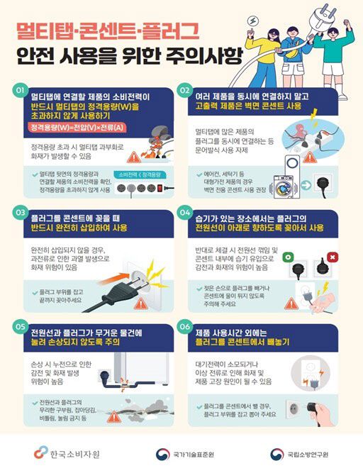 이밖에 에어컨, 온열기 같이 높은 소비 전력의 제품은 벽면의 전용·단독 콘센트를 사용하고, 멀티탭의 전선이 휘어지거나 무거운 물건에 눌려 손상되지 않도록 관리하는 것도 중요하다.